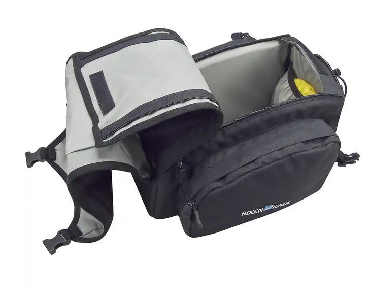 Formstabile Tasche mit gepolsterten Seitenwänden. Das Hauptfach mit Doppel-RV wird von einer zusätzlichen Stoffklappe abgedeckt, unter der auch Jacke oder Pulli verstaut werden können. Das Flaschenfach an der Rückseite lässt sich mit Zurrgurt flach anlegen. Mit Reflektor, Lampenhalter, Tragegriff und Regenhaube. Max. Belastungsgewicht 6 kg.