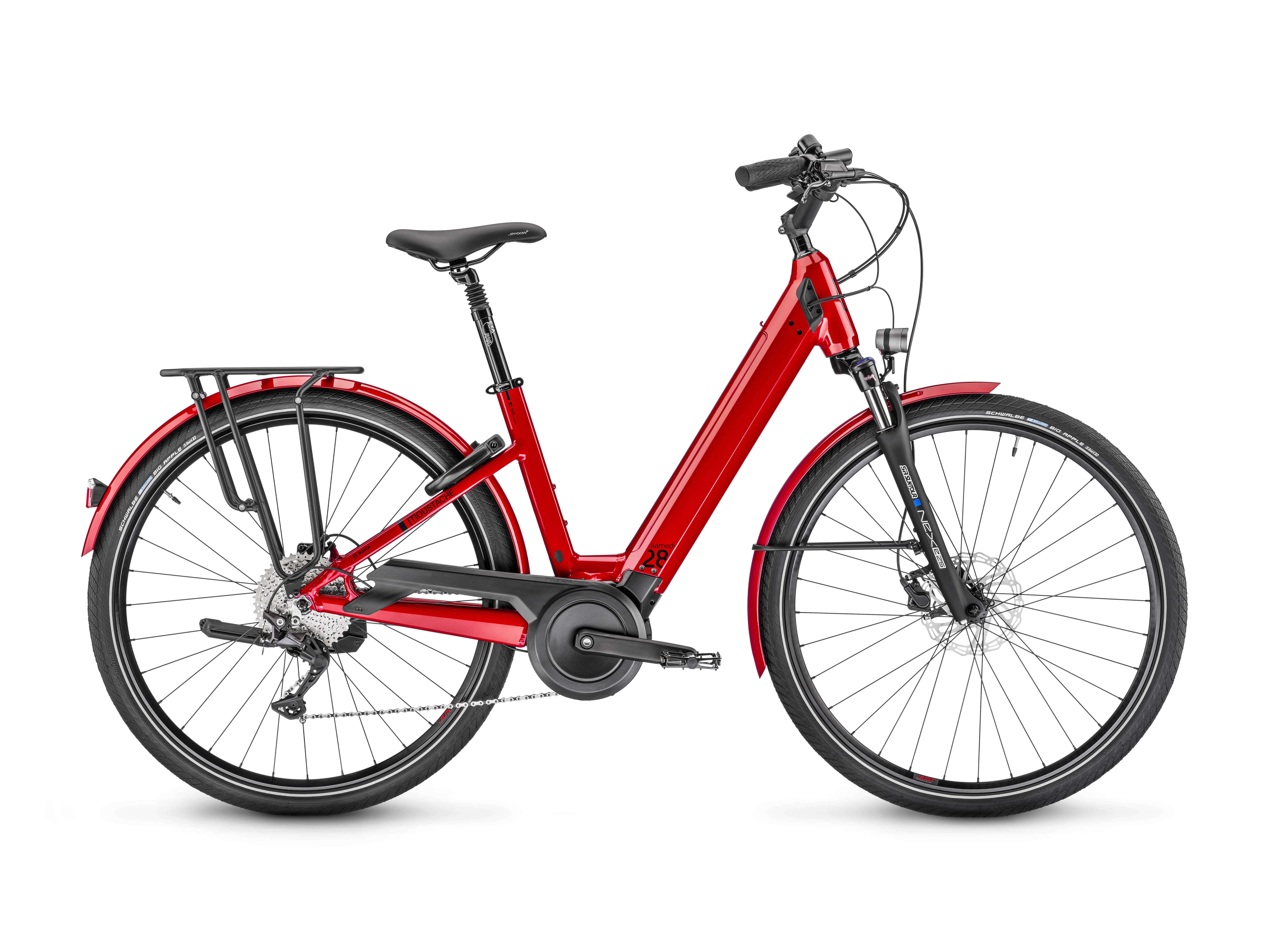 Der komfortable und dynamische Rahmen, der integrierte 500 Wh starke Bosch PowerTube Smart System-Akku, der geschmeidige und kraftvolle Bosch Performance Line Smart System Motor, eine komfortable Federung dank 63-mm-Federgabel und gefederter Sattelstütze mit 40 mm Federweg, sein berühmter Moustache Riser-Lenker für eine komfortable Sitzposition, der praktische Gepäckträger und die lackierten Schutzbleche für eine unvergleichliche Optik machen das Samedi 28.5 zur perfekten Alternative zum Auto.