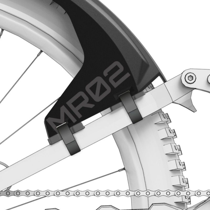Das MR02 Mudguard hinten besitzt eine zweistufige Winkelverstellung durch unterschiedlich hohe Gummifüße. Damit gelingt eine optimale Anpassung an verschiedene Hinterbau-Systeme. Mit dem verwindungssteifen Chassis, welches durch die Verwendung einer strukturell optimierten Wabenstruktur verstärkt wird, steht einer wackelfreien Befestigung am Mountainbike nichts mehr im Wege.